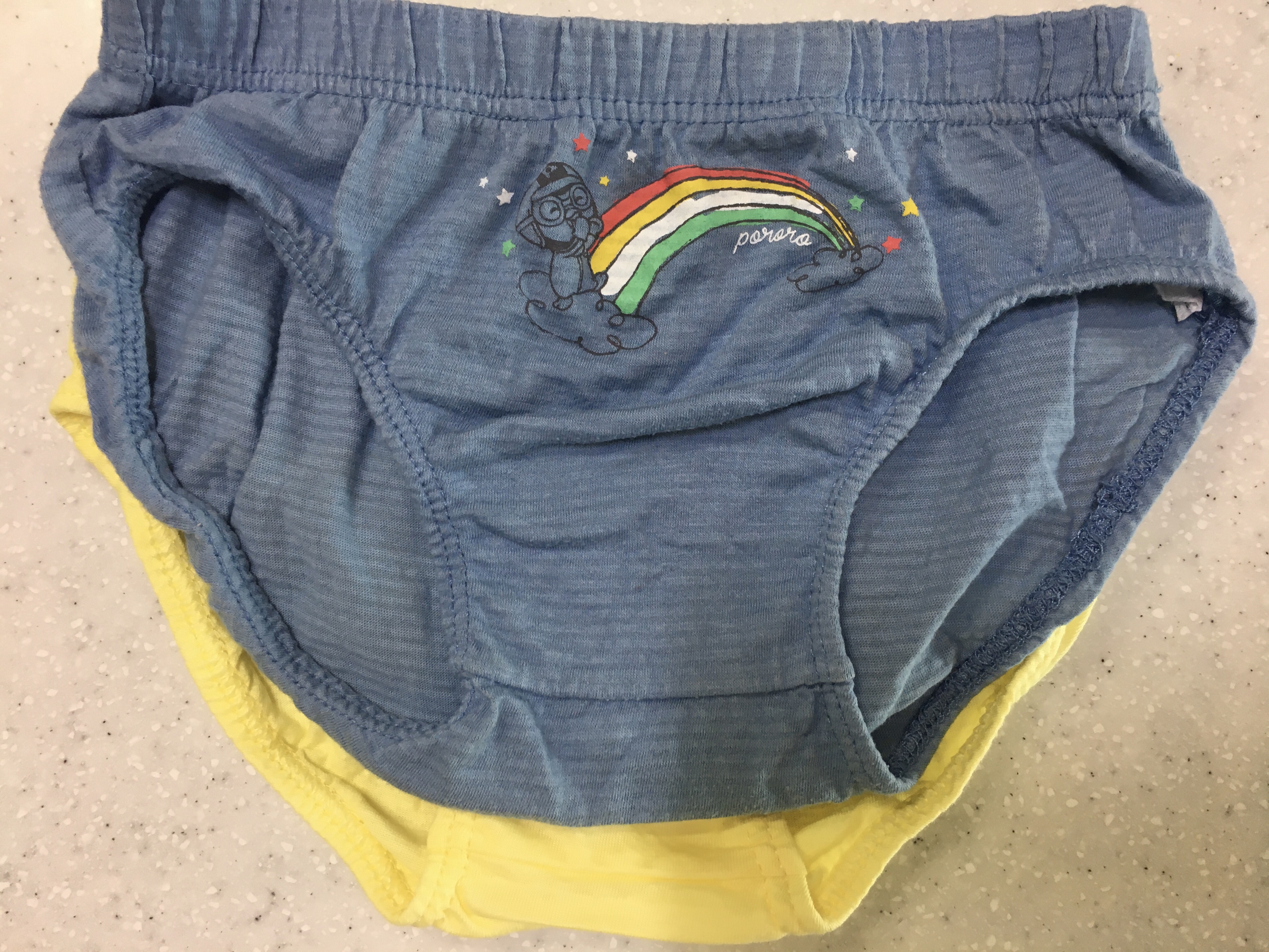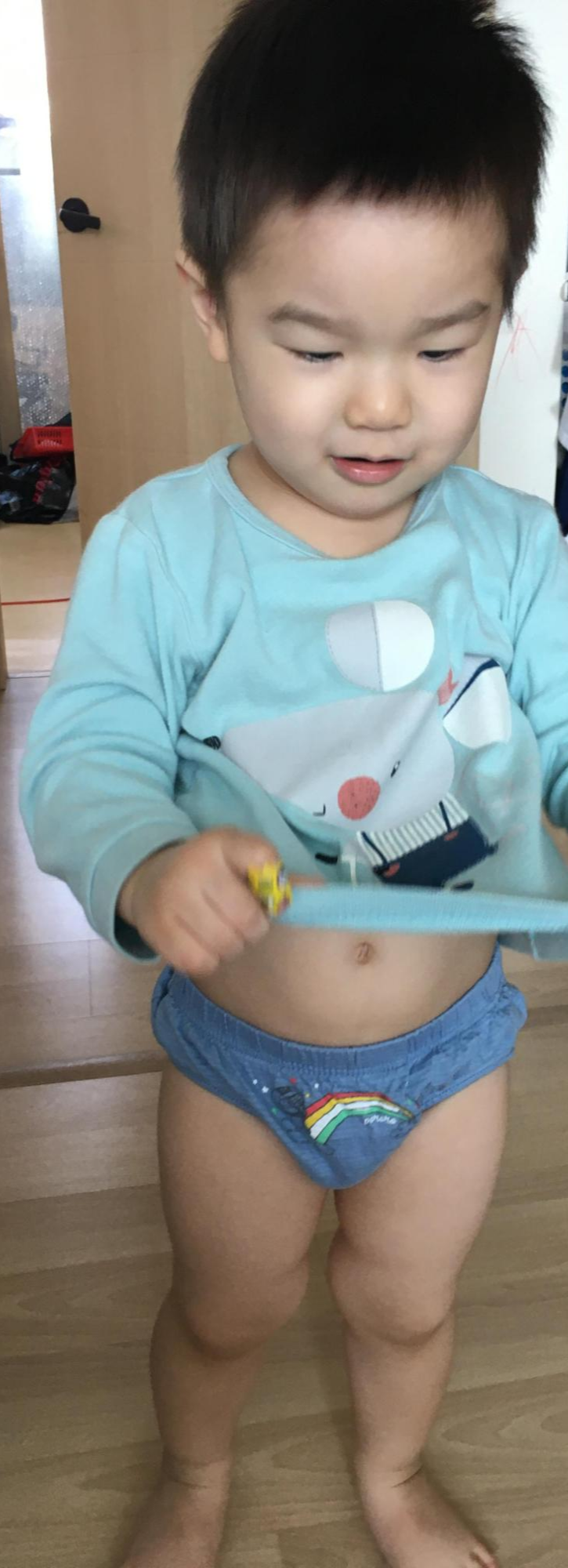 6. 예상과 다르게 오히려 소변 가리기가 더 힘들었어요. 아래 사진처럼 하루에 3-4번씩 소변을 그냥 봐서 팬티와 바지가 젖었구요. 거의 매일 팬티, 바지를 빨래 돌렸던거 같아요. 하지만 실수 했다고 해서 절대 짜증을 내거나 야단을 쳐서는 안되구요. "실수해도 괜찮아. 쉬가 많이 마려웠구나, 다음에는 꼭 변기에서 하자" 해줬어요.